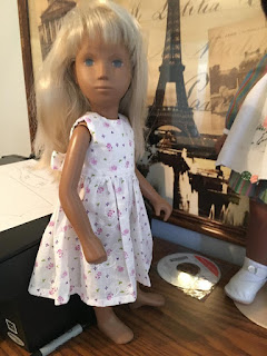 I decided to sew something new instead of doing shoes. I am counting altering patterns as my "something new" as it usually takes me the better part of a day to test a pattern and then alter to get a fit I like. You have probably noticed I like a tight fit with very little ease. The pictures below show the test pattern (on Cora) and then the final dresses that resulted (the off white ones). Perhaps you can see the looser fit and lower armholes of Cora's dress. I tightened the neckline, made the bodice smaller and raised the armhole quite a bit. Once I had something I liked I made the white with green trim from a vintage table runner and the gold trimmed from 2 placemats.