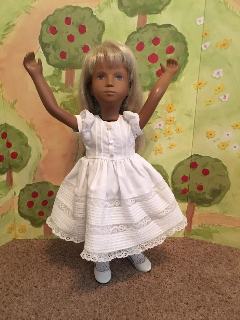 I decided to sew something new instead of doing shoes.  I am counting altering patterns as my "something new" as it usually takes me the better part of a day to test a pattern and then alter to get a fit I like.  You have probably noticed I like a tight fit with very little ease.  The pictures below show the test pattern (on Cora) and then the final dresses that resulted (the off white ones).  Perhaps you can see the looser fit and lower armholes of Cora's dress.  I tightened the neckline, made the bodice smaller and raised the armhole quite a bit.  Once I had something I liked I made the white with green trim from a vintage table runner and the gold trimmed from 2 placemats.